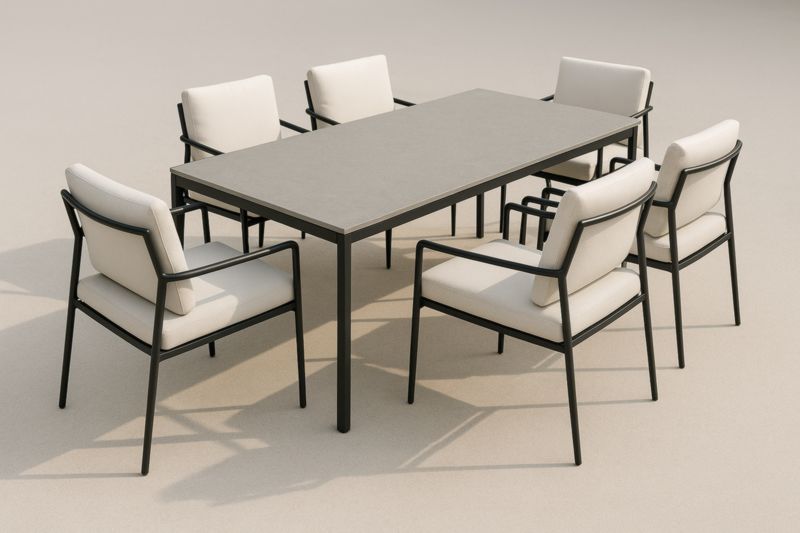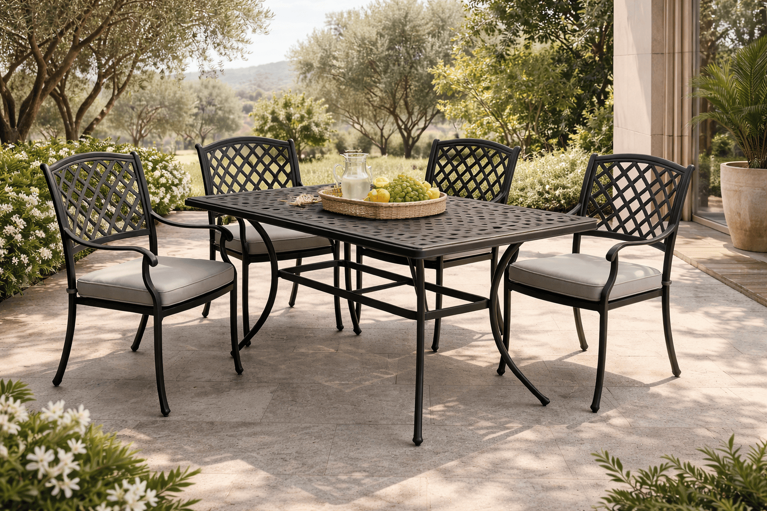 Un ensemble de table conçu pour le jardin et la terrasse, avec une structure stable et un agencement adapté aux repas et aux moments de convivialité en plein air.